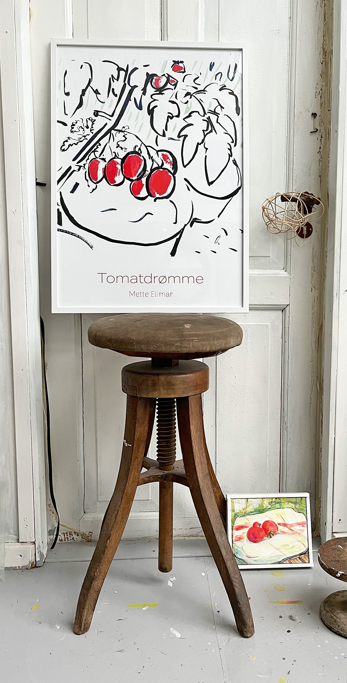Jeg holder af at opleve drivhuset gennem mine øjne og hænder. Oplevelserne bliver til skitser lavet med flydende tusch eller som små malerier. En af tuschtegningerne fra drivhuset er blevet til tomatplakaten.